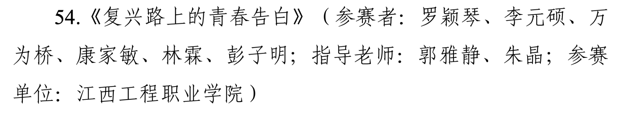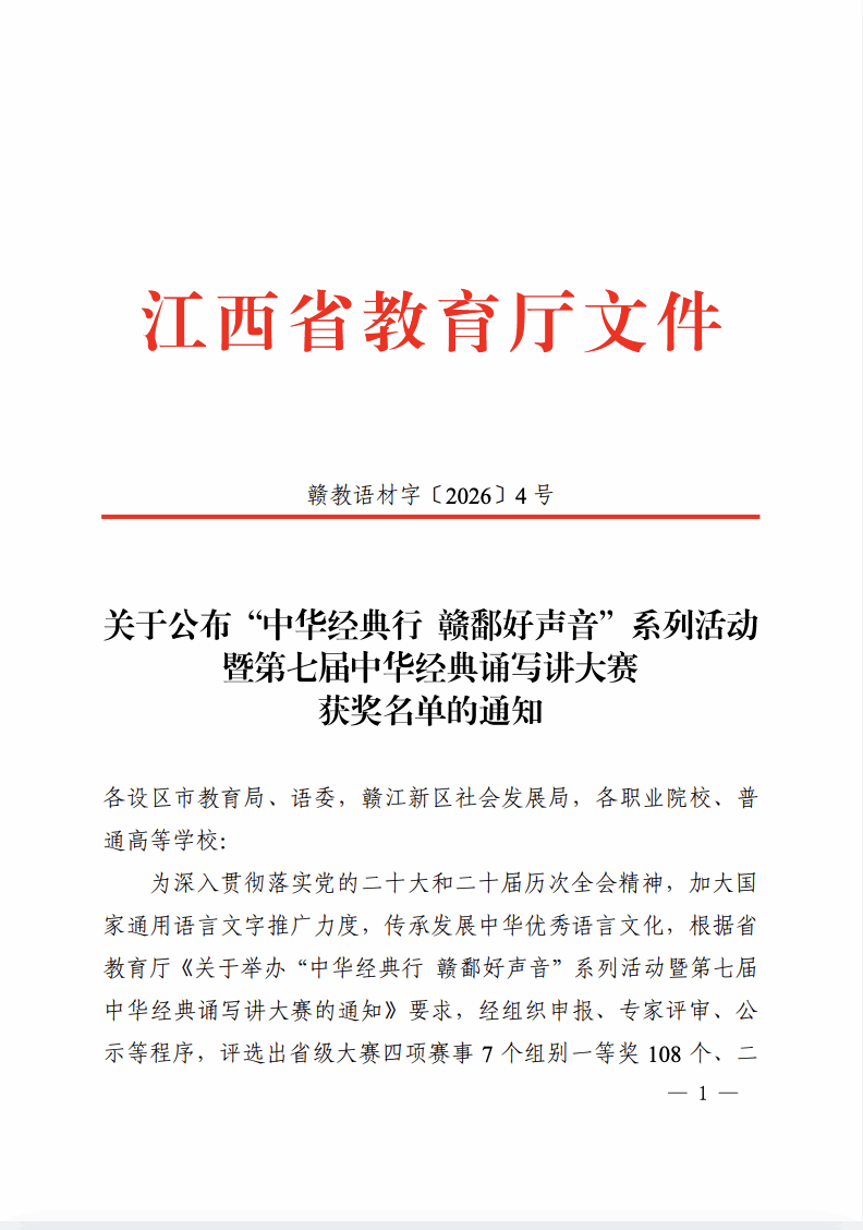近日,江西省教育厅公布“中华经典行 赣鄱好声音”系列活动暨第七届中华经典诵写讲大赛获奖名单。由学校罗颖琴、李元硕、万为桥、康家敏、林霖、彭子明六位同学组成的团队,在郭雅静、朱晶两位老师指导下,凭借作品《复兴路上的青春告白》荣获诵读大赛(职业学校学生组)三等奖。